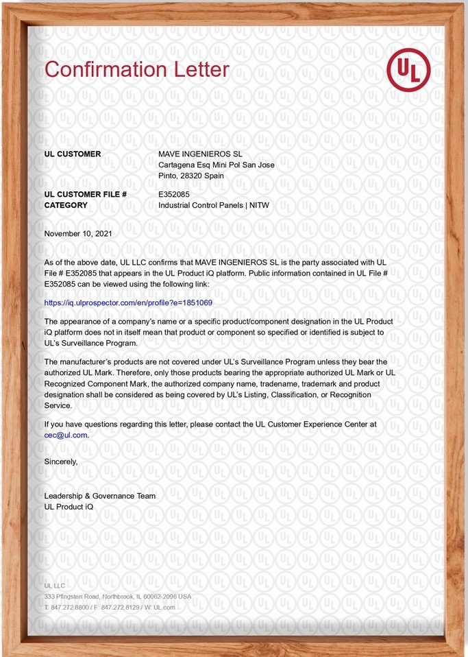Mave Ingenieros está certificada por UL bajo la norma UL 508A. Contamos con nuestro propio FILE y estamos sometidos a continuas inspecciones por UL garantizando el buen uso de la norma y el diseño de todos nuestros armarios. Para ello nuestro personal ha tenido que superar con éxito el estricto examen oficial de UL y poder certificarse como MTR (Manufacturers Technical Representative). Esto significa que estamos formados y habilitados para cumplir con las normativas americanas tanto en EEUU como en Canadá (así como en otros países que se acogen a la norma UL).
